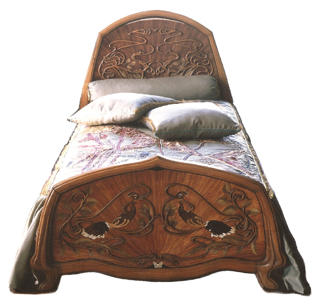 Lit Art nouveau inspiré d’ Hector Guimard. Création des dessins de bas reliefs et marqueterie. Réalisation par Malaga, Franck Morandi, Felix, Mauricio Merlo Goncalves. 1986