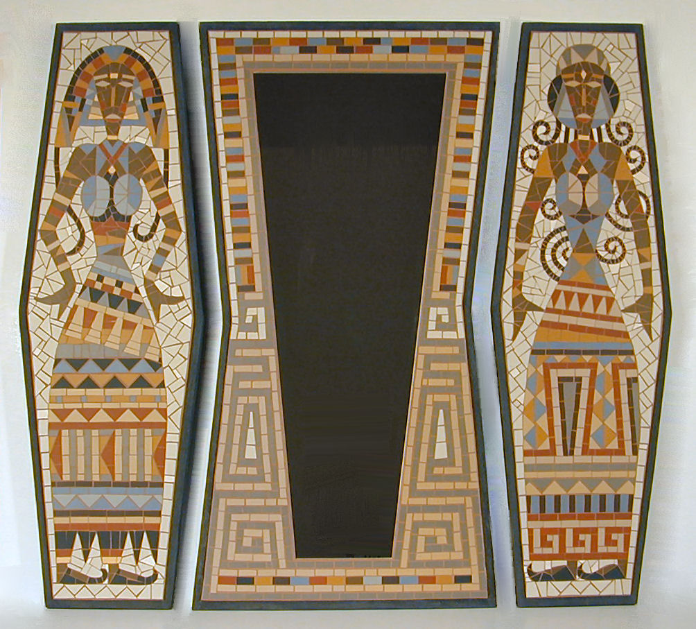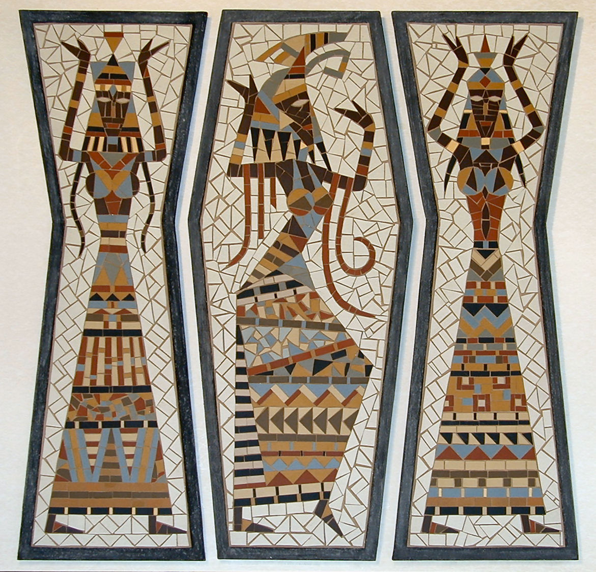 Danseuses stylisées Triptyque. Grès, verre opalescent et opaque, pâte et émaux de verre, métal. 74 x 25 cm (x3) 2007