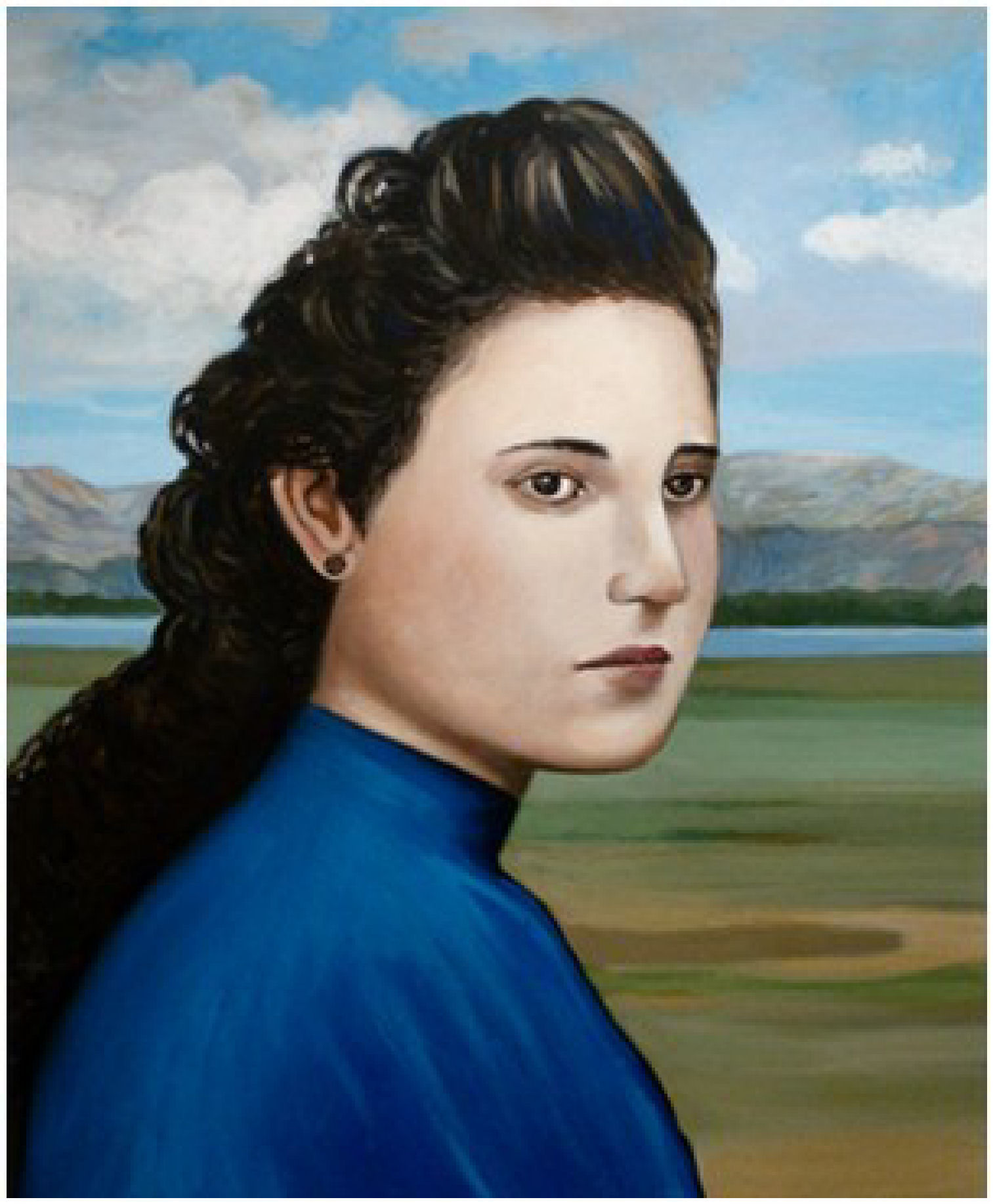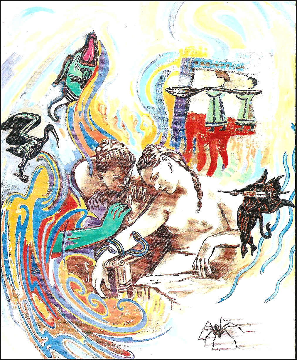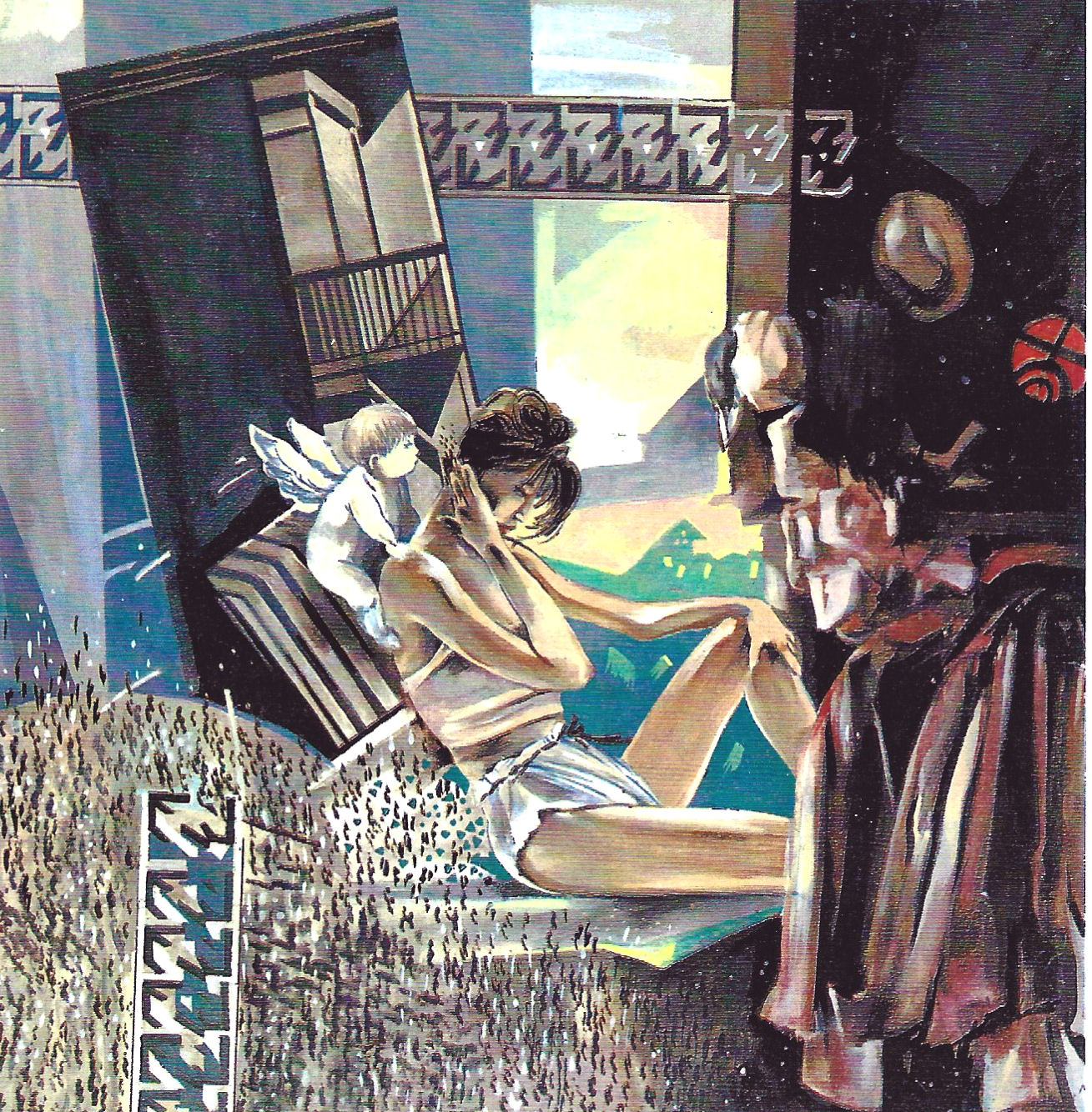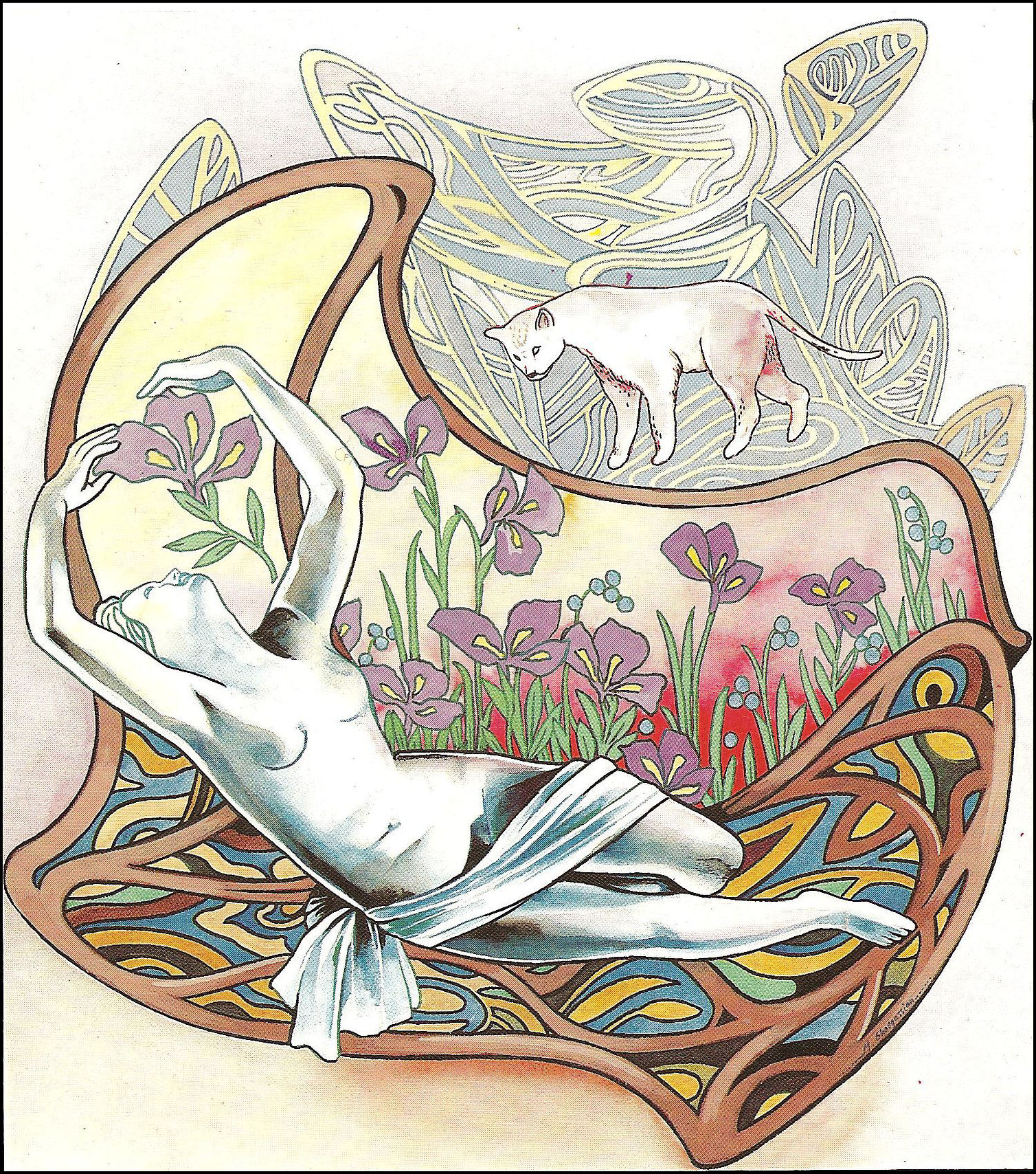 La porte Adaptation/interprétation de Psyché entrant dans le jardin de l’Amour de John William Waterhouse. Acrylique sur toile, marouflée, 55 x 45 cm.