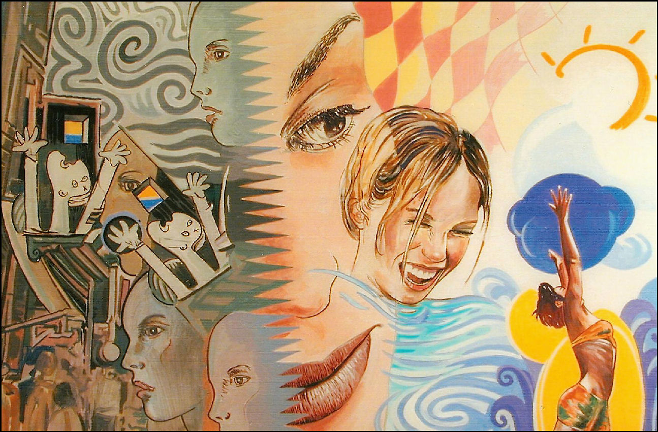 Assemblée extraordinaire Peinture: acrylique sur toile, 78,5 x 158,5 cm. Mosaïque (cadre) : émaux métallisés, grès émaillé/métallisé, pâte de verre, 86 x 166 cm. 2020