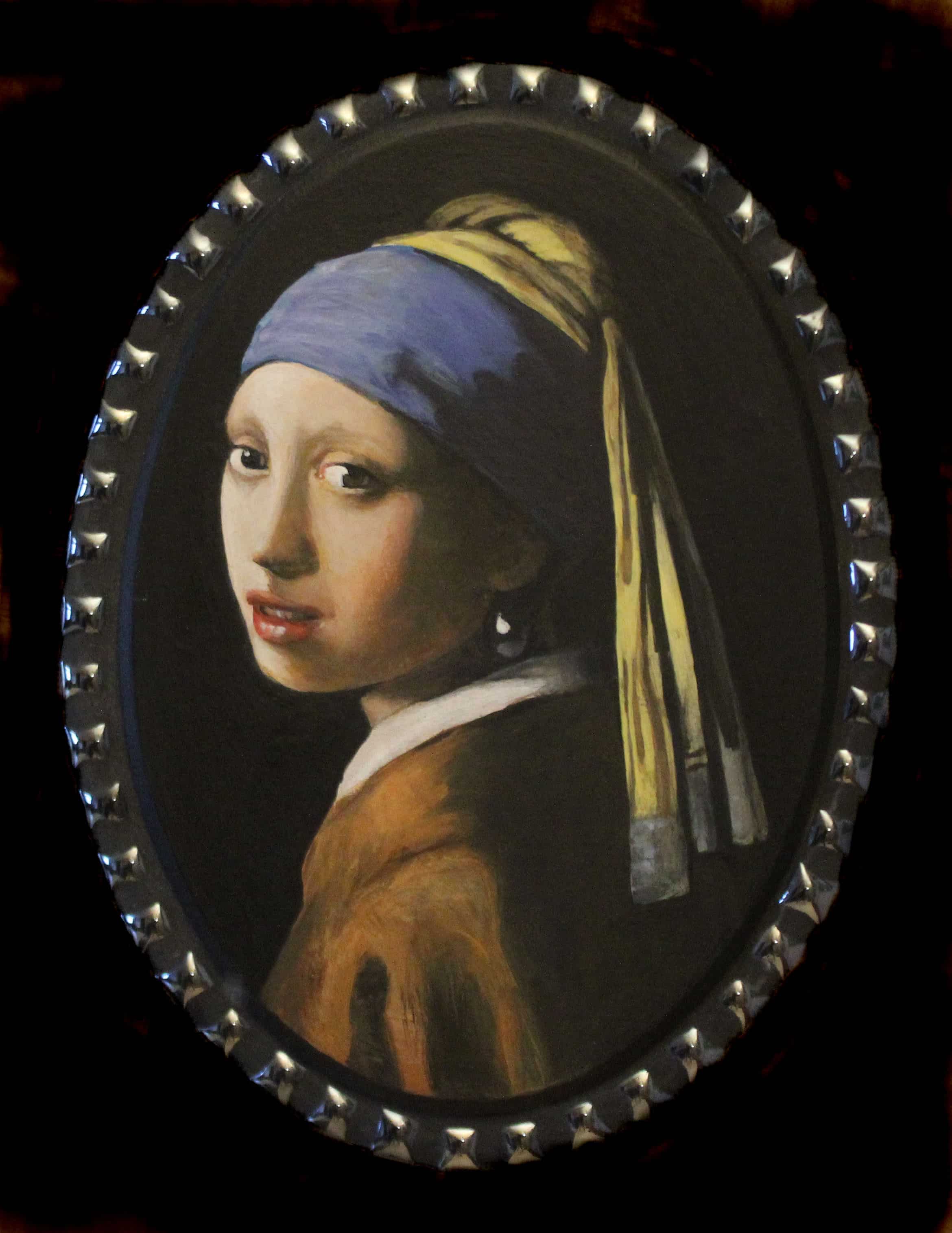Interprétation/Adaptation de La jeune fille à la perle d’après Johannes Vermeer Acrylique sur bois, sur ovale bordé d’émaux métallisés et de grès émaillé, 25 x 19 cm. 2025